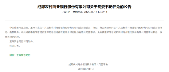 同日,《成都农村商业银行股份有限公司关于党委书记任免的公告》显示,中共成都市委决定,王晖任中共成都农村商业银行股份有限公司委员会委员、书记,免去黄建军中共成都农村商业银行股份有限公司委员会书记、委员职务。中共成都市委同意提名王晖任成都农村商业银行股份有限公司董事长,免去黄建军成都农村商业银行股份有限公司董事长职务。按有关规定办理。