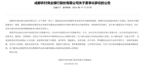 8月18日金融一线消息,成都农商银行日前发布《关于董事长辞任的公告》称,该行董事会于近日收到黄建军提交的书面辞职报告至德投资,黄建军因组织安排工作调动,辞去该行第四届董事长、董事、董事会战略规划委员会主任委员及董事会金融服务乡村振兴委员会主任委员职务。经黄建军确认,其与该行董事会无不同意见,亦无任何与辞任有关的事项需要通知该行股东及债权人。